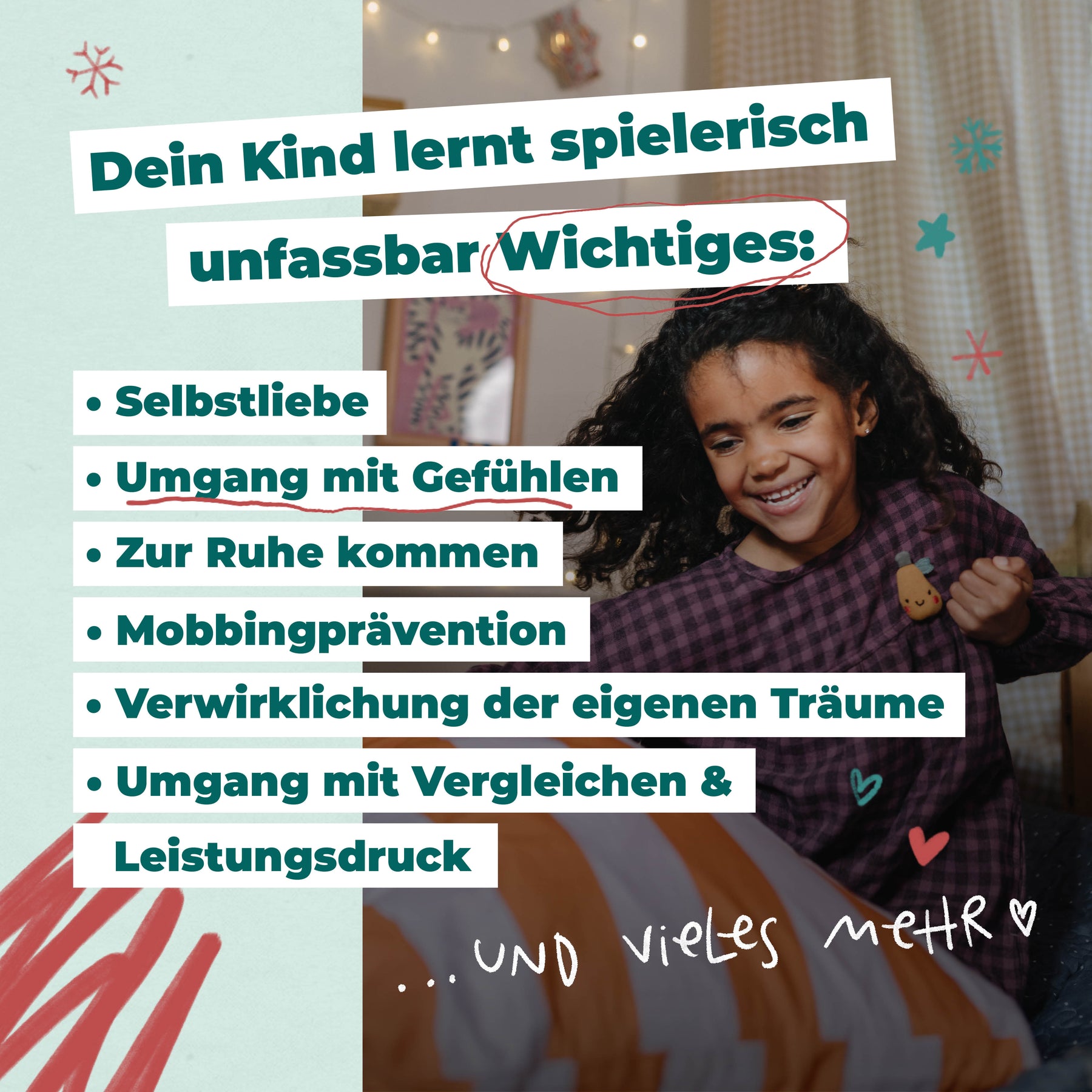 Die Inhalte sind achtsam verpackt und fördern kindgerecht Selbstvertrauen, Empathie, Achtsamkeit, Resilienz, Eigenständigkeit, Kreativität und noch so viel mehr! Schon fast 20.000 Familien sind mit dabei. Für ein neues Miteinander voller Liebe, Toleranz und Empathie!