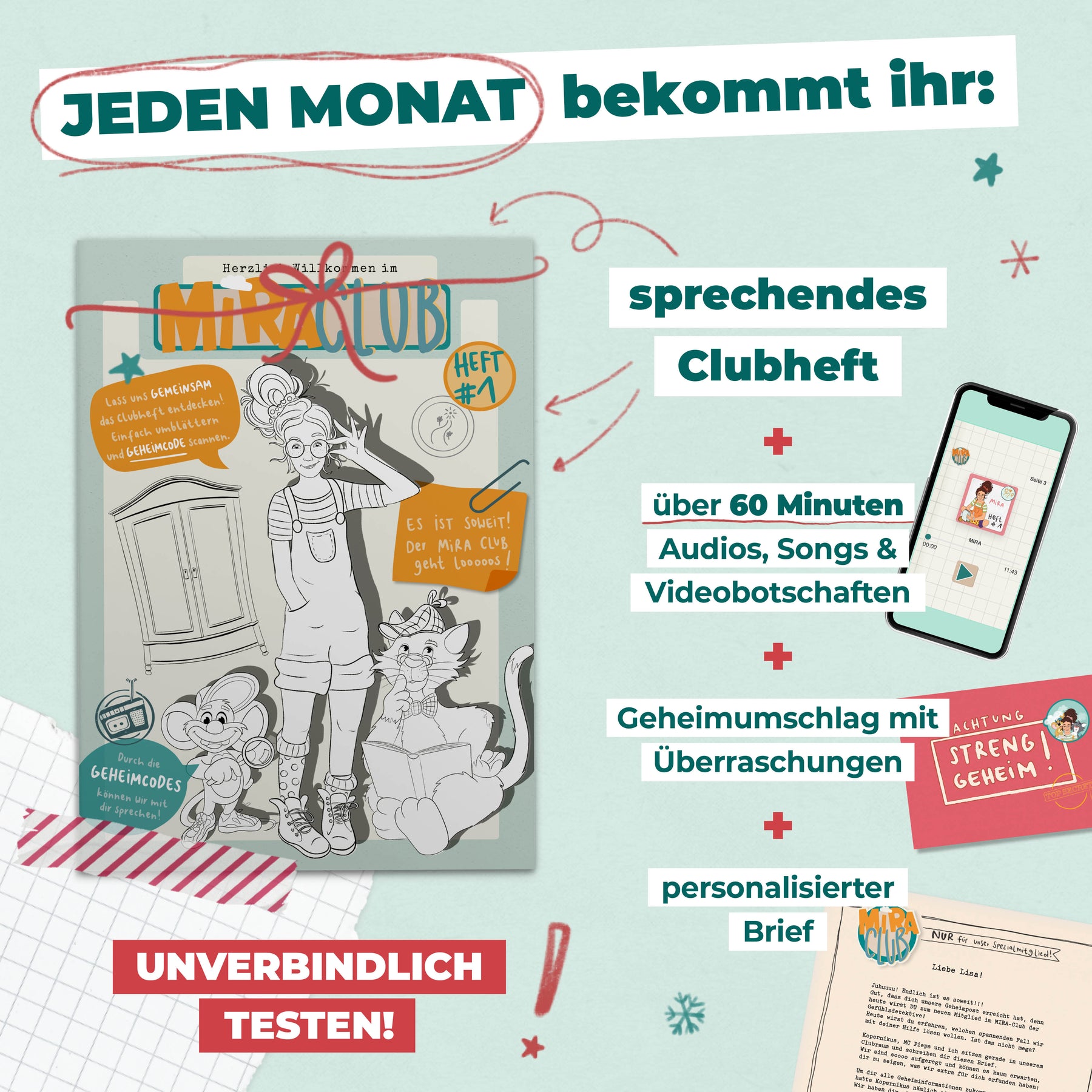 Hinter jedem Geheimcode stecken exklusive MiRA-Audios – voll mit Gefühl, Wissen und Mitmach-Momenten. Insgesamt erhältst du je Heft über 1 Stunde “Hörmaterial”, unterteilt in kleinere Abschnitte von meist ca. 10 - 15 Minuten.